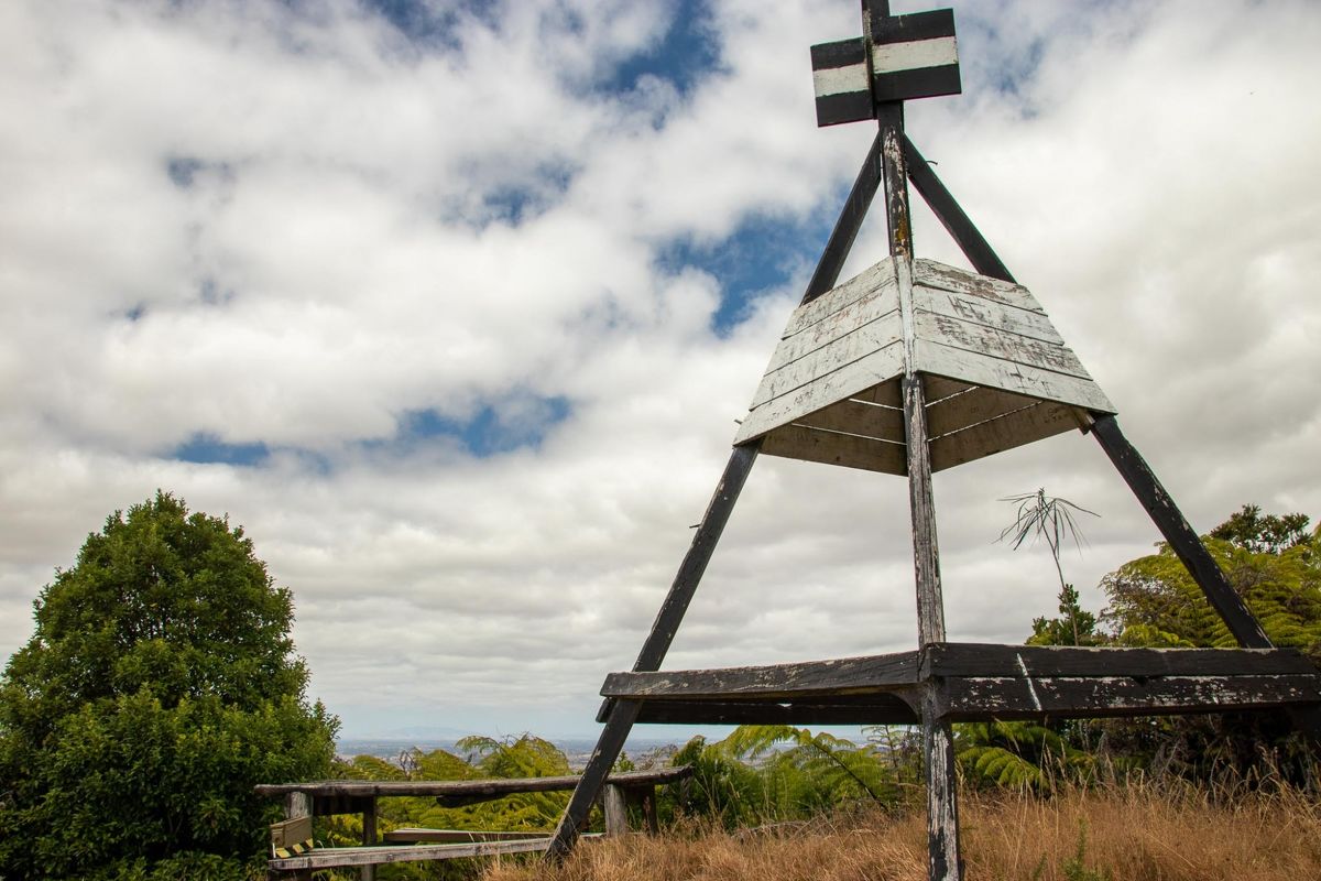 The track meets the Hakarimata Walkway and the summit tower at 374 metres above sea level. In spring you can smell the scented daphne, Alseuosmia hakarimata or topara growing beside the track. The tower provides good views out towards the coast and across the Waikato Basin and down to Ruapehu on a clear day.